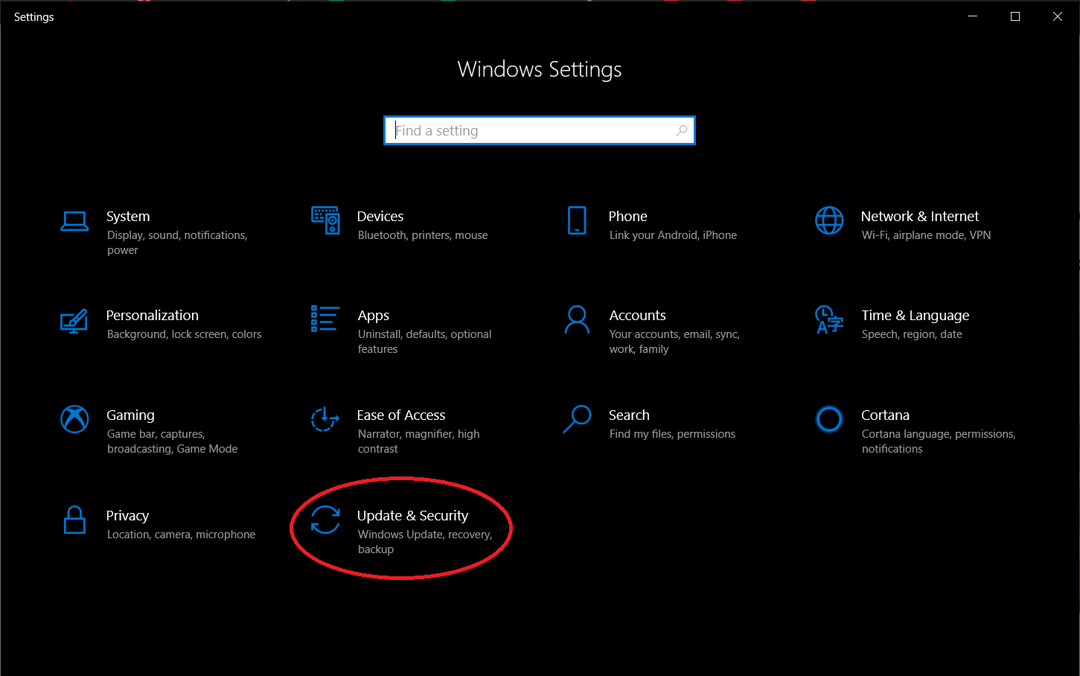 Click the Start Menu and select the gear icon in the lower left to open up the Settings window. You can also select the Settings app from the app list. Under Settings, click Update & Security to continue.